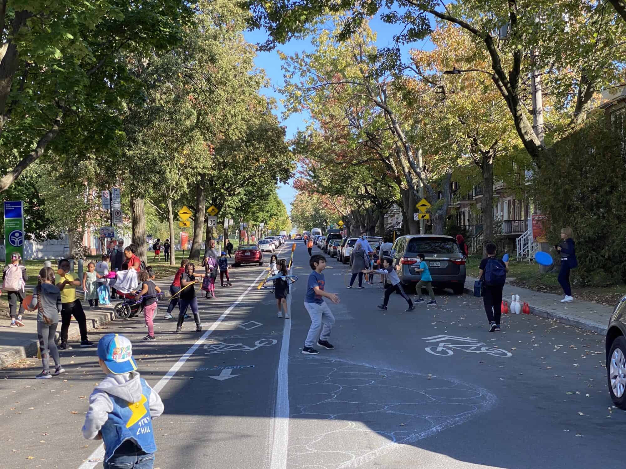 Children playing in the École Sainte-Bernadette-Soubirous School Street/rue-école in Montréal (photo by: Centre d’écologie urbaine)