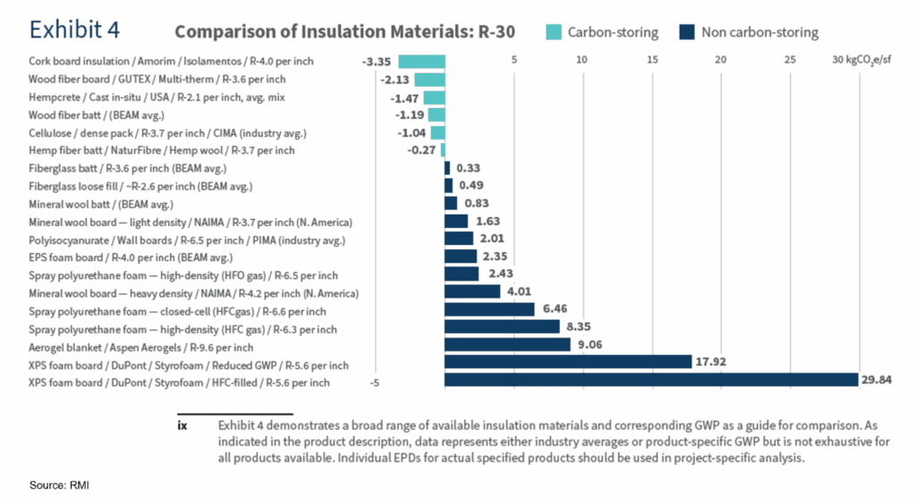• The embodied or material carbon rating will tell you whether the production of that product had a negative, neutral, or positive impact on our climate. This last consideration is one that’s gaining attention. This is because, particularly for insulation, production-related carbon emissions (embodied emissions) can sometimes outweigh the climate benefits of using the material to reduce heat loss over time (operational emissions). But, embodied and operational emissions don’t have to be at odds! Organizations, including Builders for Climate Action, have developed tools (like the BEAM tool) to help you find the carbon footprint of your building materials and make climate-smart choices.