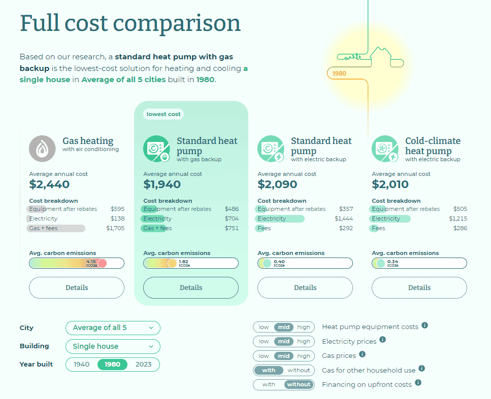 This interactive tool helps you to compare the cost of heat pumps to other home heating and cooling options in five cities across Canada. It was developed by experts at the Canadian Climate Institute based on extensive economic analysis.