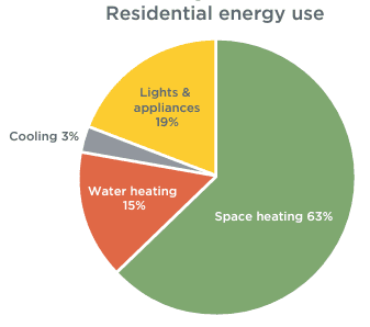 In Canada, home energy use is mostly space heating. Followed by hot water heating, lighting, and appliances.