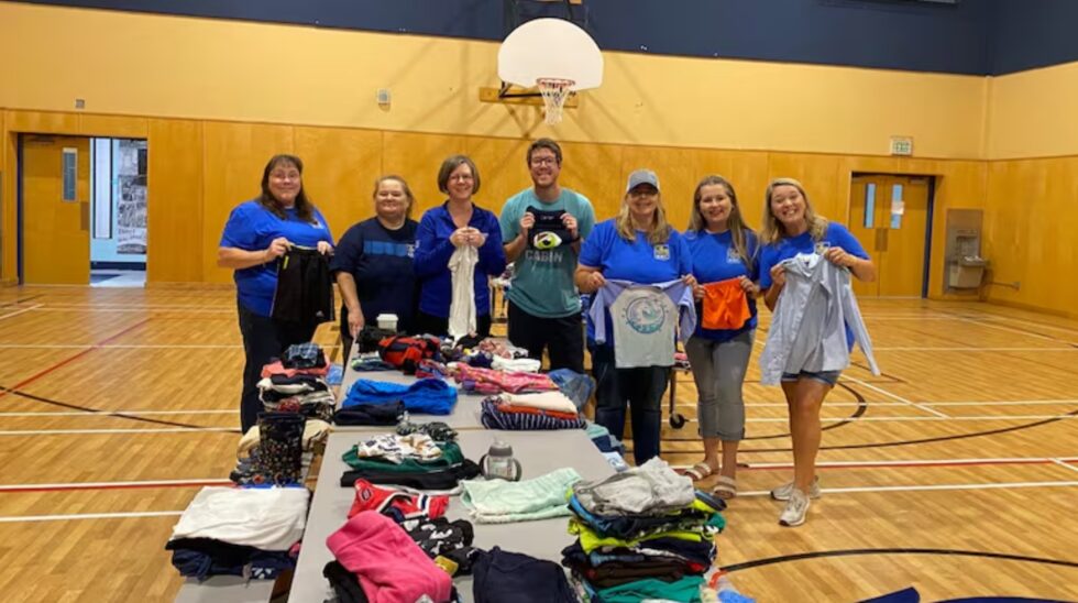 Queen Elizabeth School vice-principal Kyle Bishop, centre, is shown with volunteers and organizers during the school’s first back-to-school shop, in Moncton, N.B., on Aug. 19. The shop gave families a chance to choose from donated items ahead of the first day of school, all for free. (Submitted by Kyle Bishop)